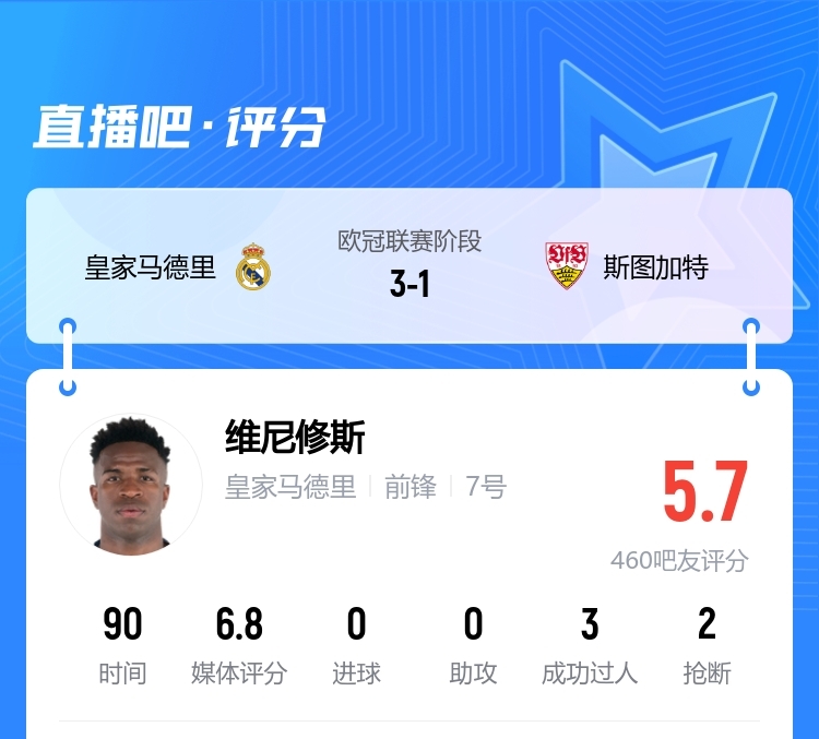 吧友评分方面,姆巴佩、维尼修斯、哈兰德三人得分均未及格,其中哈兰德得分最低仅5.3分。只有贝林厄姆一人得到了8.7分的最高分。