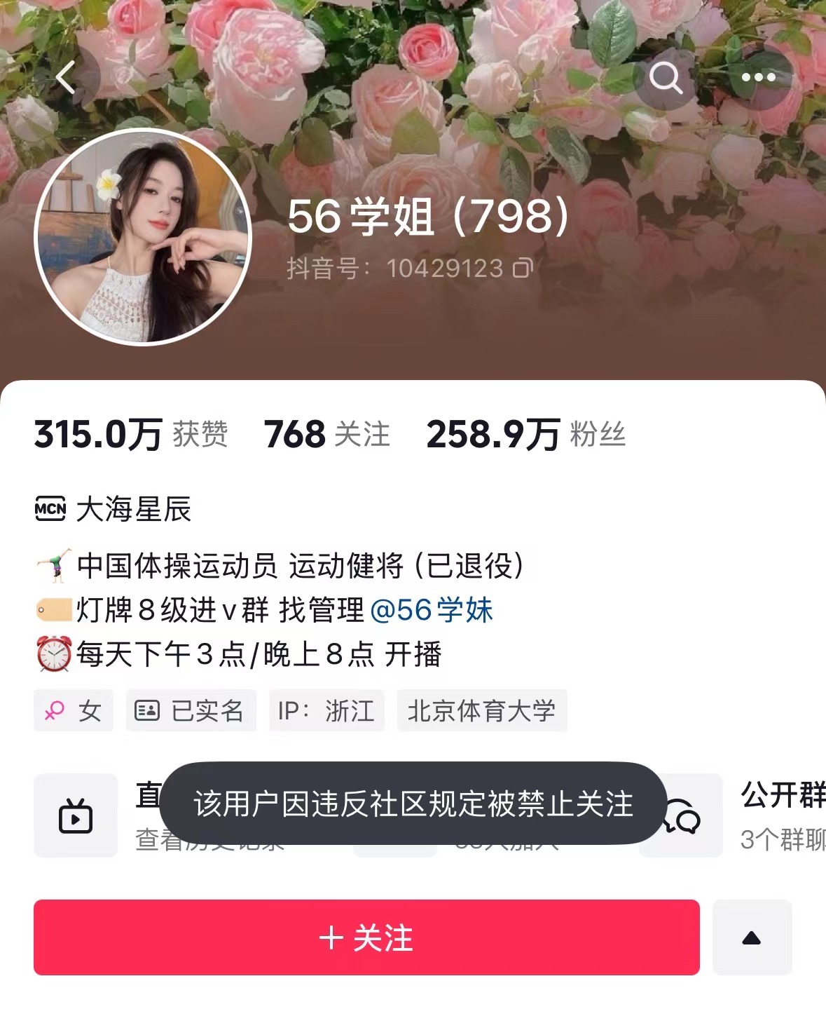 11月24日吴柳芳抖音账号无法被关注,系统提示该用户违反社区规定。